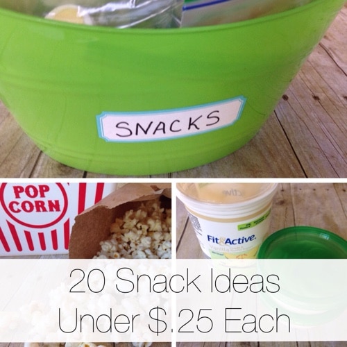 I like to keep around snacks that will be filling and still not be really expensive. So, I put together a list of 20 snack ideas under $.25 each.