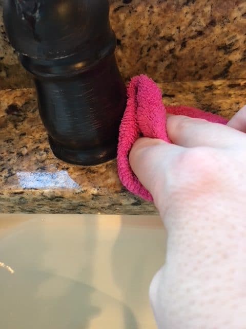 When you have all of the granite countertops scrubbed down then wash out the microfiber cloth and wipe down the granite countertops one more time with just water. Make sure you get all the soap residue from the countertops.