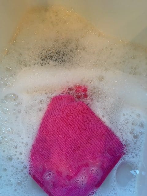 Wet and wring out a microfiber cloth in the soap mixture and scrub your countertops. Make sure you scrub the edges too. My sink edges are often neglected in everyday cleaning so it's amazing how dirty they can get.