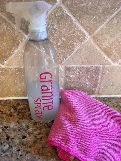 Now that your countertops are clean it is time to add some sparkle to them! I love this DIY granite spray to get them disinfected and sparkly clean. The rubbing alcohol kills any germs that might be left in the porous granite.