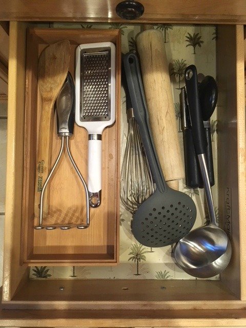 I donated the cheese grater that was in the drawer and the bamboo box. My plastic strainer was broken in a few places, so I bought a new one and threw out the old one.