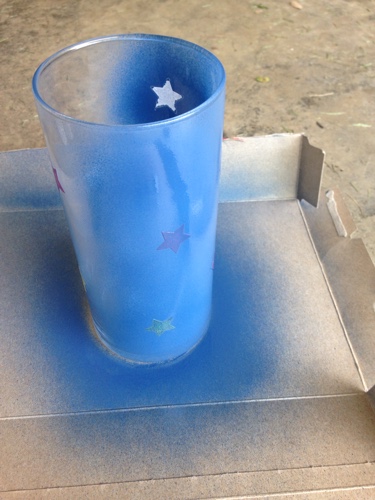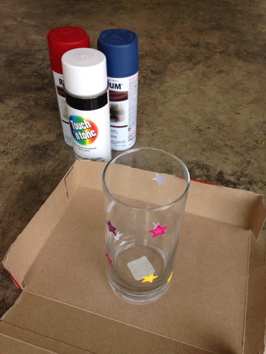 Once you have on all the star stickers, grab your spray paint and get started. It was a windy day here, so I spray painted in my garage. Make sure you lay down something first so you don't get paint everywhere. I cut open an old cereal box we were throwing away.
