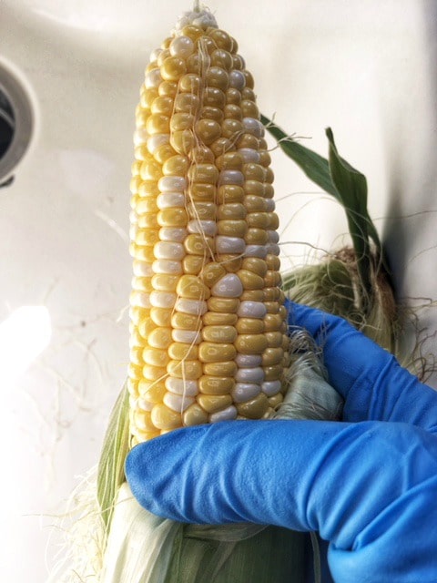 Once you remove all the husks you will still have plenty of corn silk on the corn on the cob. To remove the corn silk put on the rubber glove and gently run your hand over the corn on the cob a few times. The friction from the glove will easily remove the corn silk from the cob. The corn silk tends to stick and get removed easier from the stickiness of the glove. It only takes a few seconds to get off most of the extra corn silk.