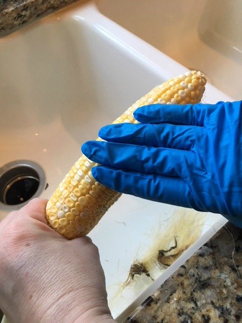 To easily remove corn silk you don't need a fancy corn silk remover, just a rubber glove. I use these disposable gloves from Amazon, but you could also get some reusable kind and keep them just for working with food. The dollar store usually has them for $1 so they don't have to be expensive. The rubber gloves have just a little bit of stickiness that helps easily collect all of the corn silk.