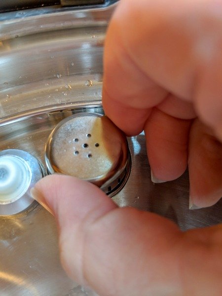 Next, take off the quick release and the steam valve cover. Wash them with warm soapy water and make sure there isn't any food or hard water stuck on them. Rinse them and set them aside.
