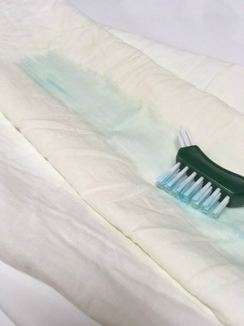 You can see below the yellow stain on the pillow case. I added a bunch of the shampoo to the pillowcase and used a small brush to rub it in.