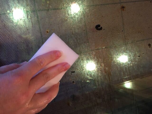 STEP 1: Wipe down the oven glass door with a magic eraser. They get rid of food particles and baked on grease better than a regular sponge. If there's any loose debris, go ahead and knock it off.