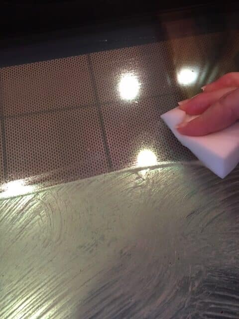 STEP 5: Use the magic eraser and spread the thick paste on the glass of your oven window. Let it sit for 5-10 minutes. Do not allow it to dry.