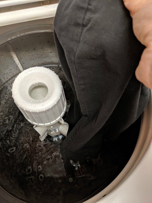 Once the machine is full add your packet (or packets) of Rit dye to the machine. Then add a cup of table salt to the machine. Let the machine swish for a minute or two to completely dissolve the dye and the salt. Why salt? It will help the color soak into the fabric better and you will get a closer dye color to the packet.