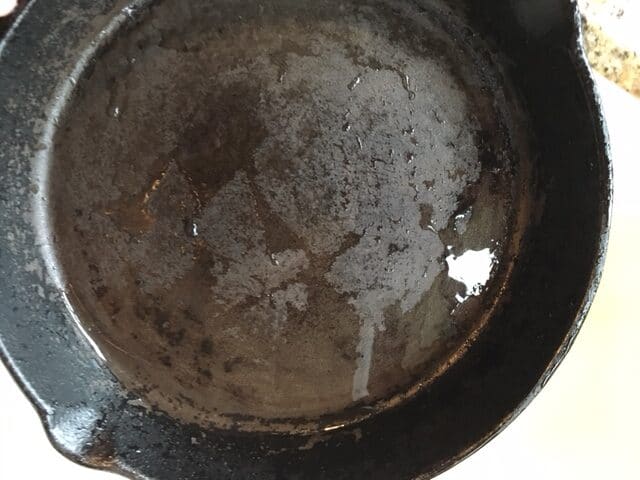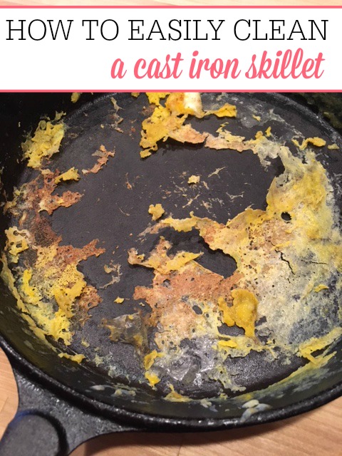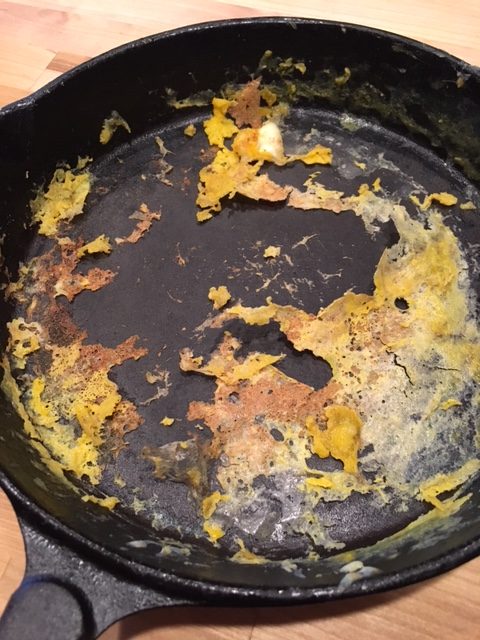 Check out my skillet before cleaning it. I made two batches of eggs in the cast iron skillet. Then, got busy and didn't clean out the skillet. I woke up in the morning to find this disgusting mess.