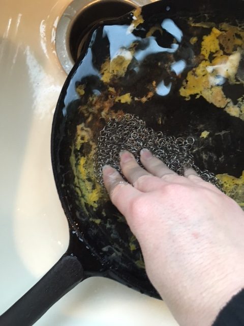 When you are done cleaning the cast iron skillet you will want to wash out your chain mail scrubber and lay it out to dry.
