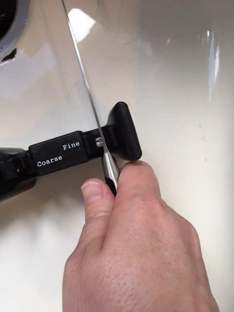 Step 1: Start by slowly running the knife from base to tip over the coarse sharpening area. You don't have to press down hard.